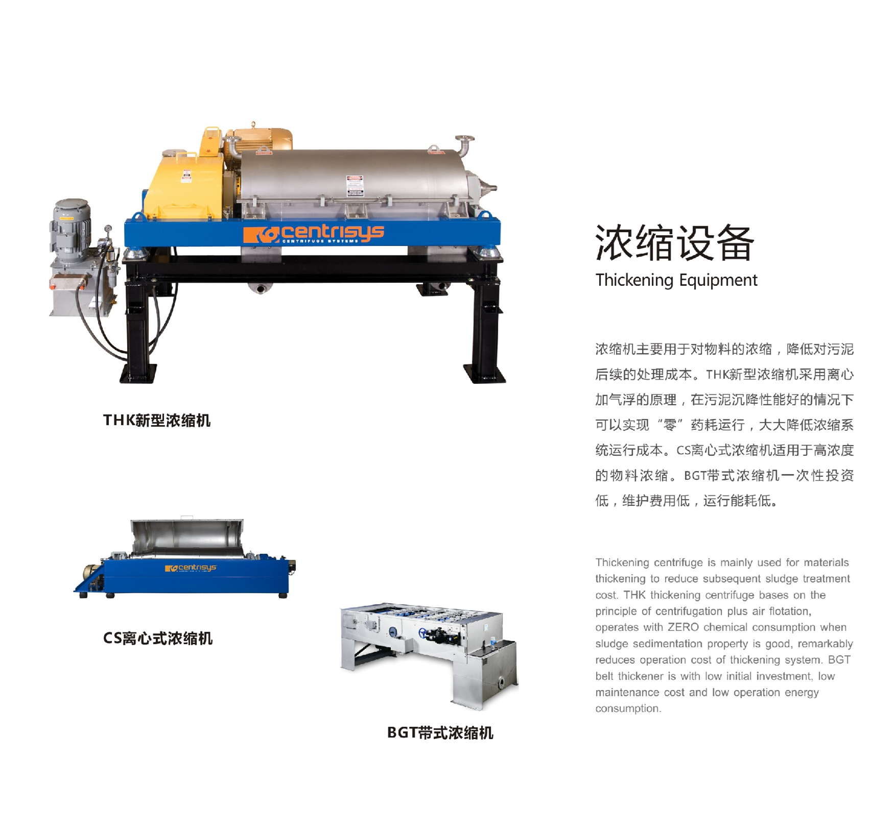 浓缩机主要用于对物料的浓缩,降低对污泥 后续的处理成本。THK新型浓缩机采用离心 加气浮的原理,在污泥沉降性能好的情况下 可以实现"零”药耗运行,大大降低浓缩系 统运行成本。CS离心式浓缩机适用于高浓度 的物料浓缩。BGT带式浓缩机一次性投资 低,维护费用低,运行能耗低。Thickening centrifuge is mainly used for materials thickening to reduce subsequent sludge treatment cost. THK thickening centrifuge bases on the principle of centrifugation plus air flotation, operates with ZERO chemical consumption when sludge sedimentation property is good, remarkably reduces operation cost of thickening system. BGT belt thickener is with low initial investment, low maintenance cost and low operation energy consumption.