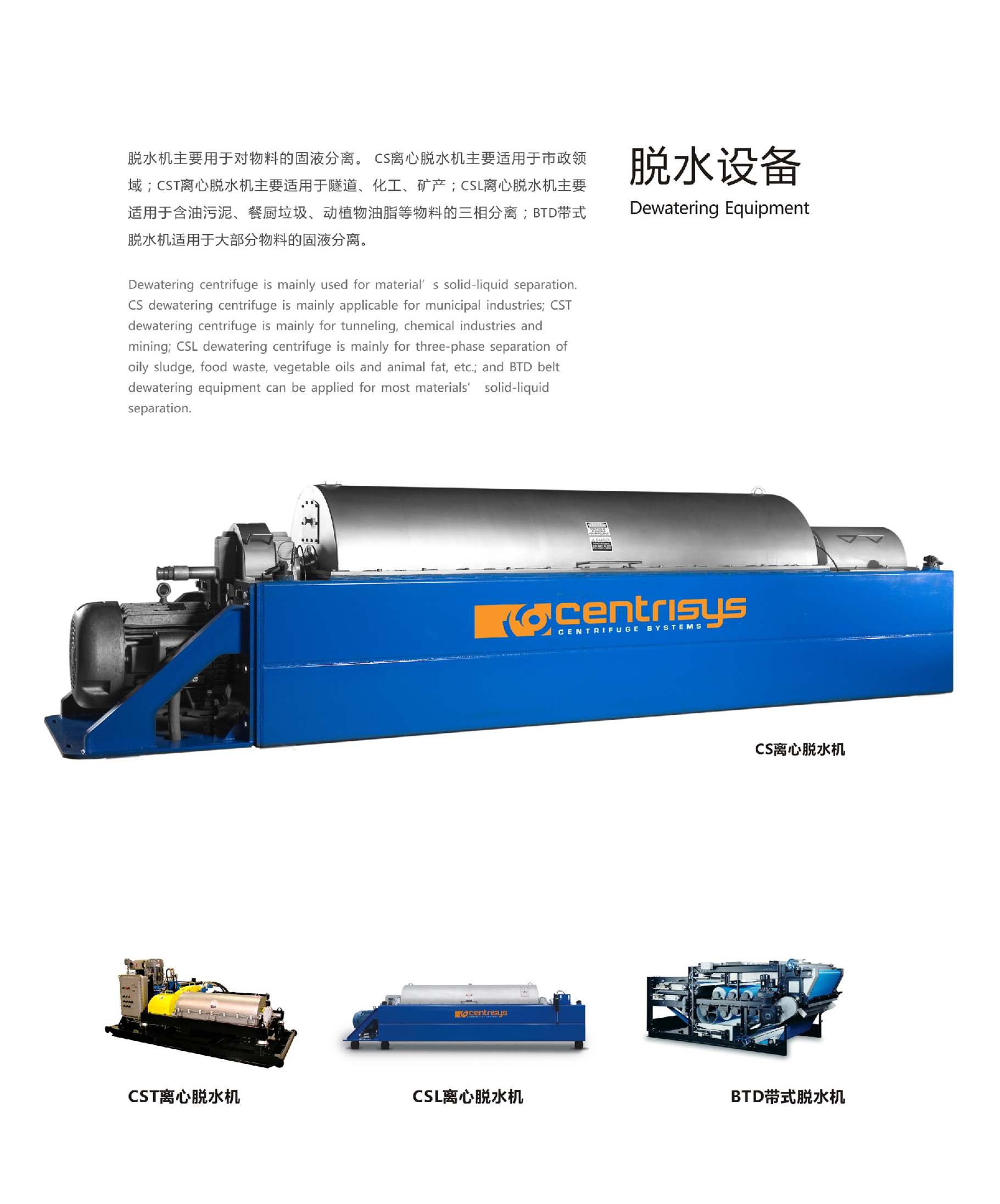 脱水机主要用于对物料的固液分离。cs离心脱水机主要适用于市政领 域;CST离心脱水机主要适用于隧道、化工、矿产;CSL离心脱水机主要 适用于含油污泥、餐厨垃圾、动植物油脂等物料的三相分离;BTD带式 脱水机适用于大部分物料的固液分离。 Dewatering centrifuge is mainly used for material7 s solid-liquid separation. CS dewatering centrifuge is mainly applicable for municipal industries; CST dewatering centrifuge is mainly for tunneling, chemical industries and mining; CSL dewatering centrifuge is mainly for three-phase separation of oily sludge, food waste, vegetable oils and animal fat, etc.; and BTD belt dewatering equipment can be applied for most materials, solid-liquid separation.
